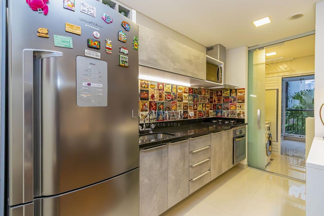 Cozinha mobiliada com armários planejados e eletrodomésticos