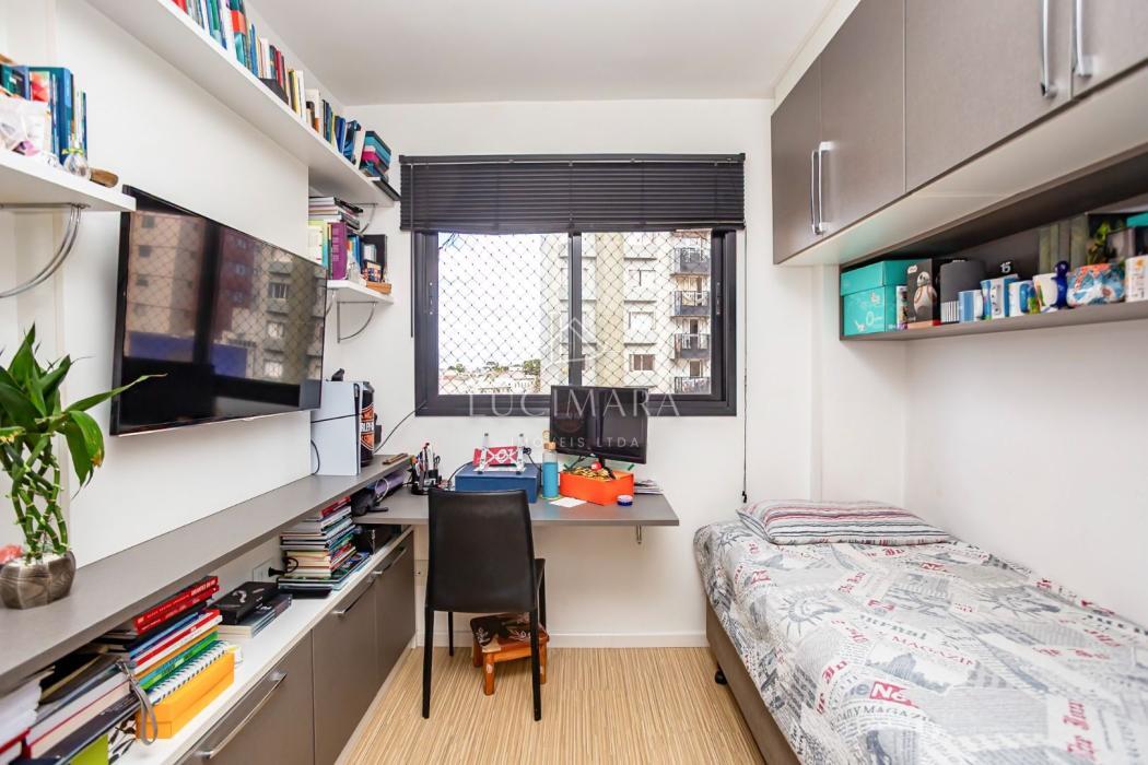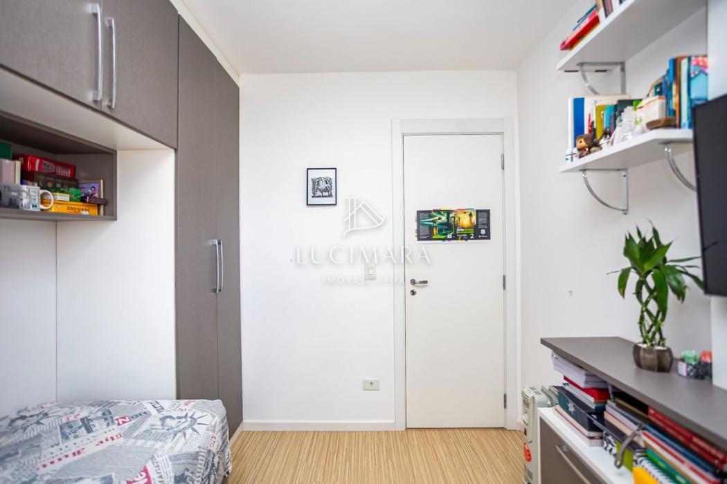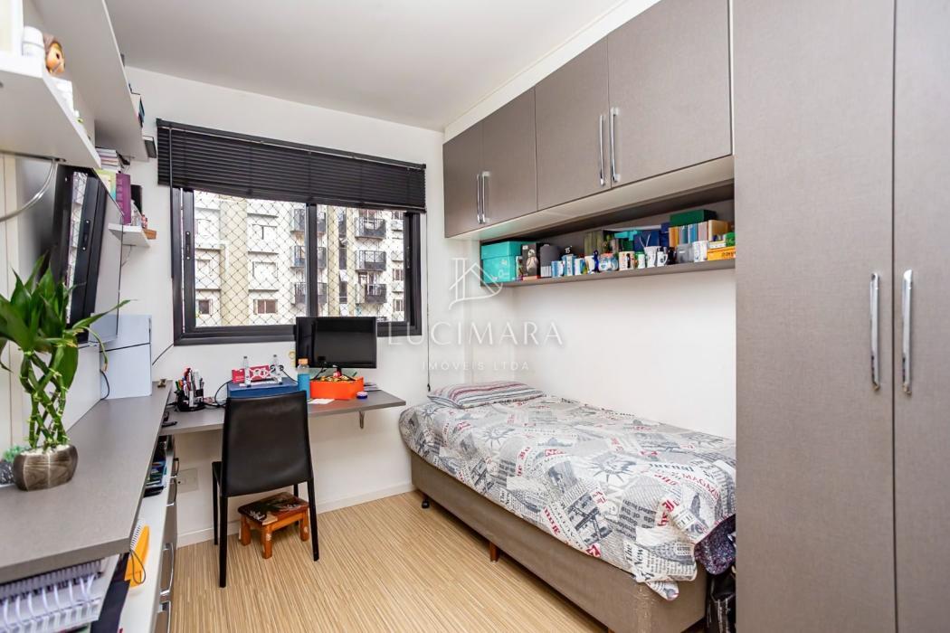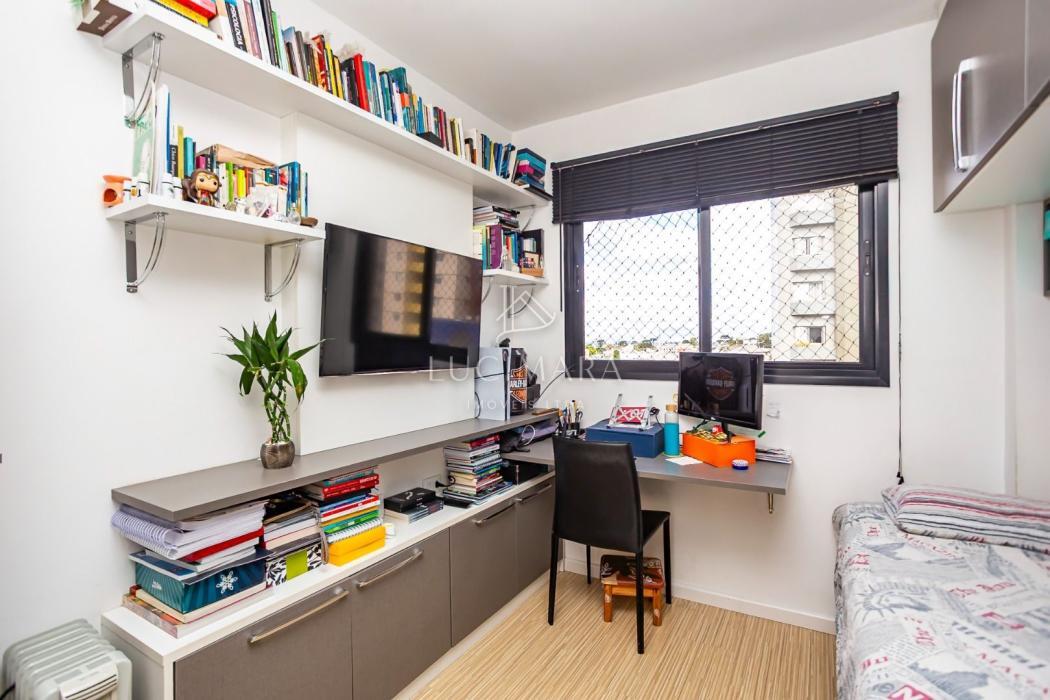 - Quarto solteiro com cortina, armário, mesa de escritório, painel e prateleiras;