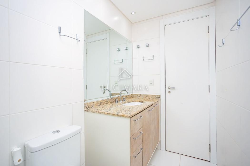 - Banheiro com box e gabinete de pia tampo em granito;
