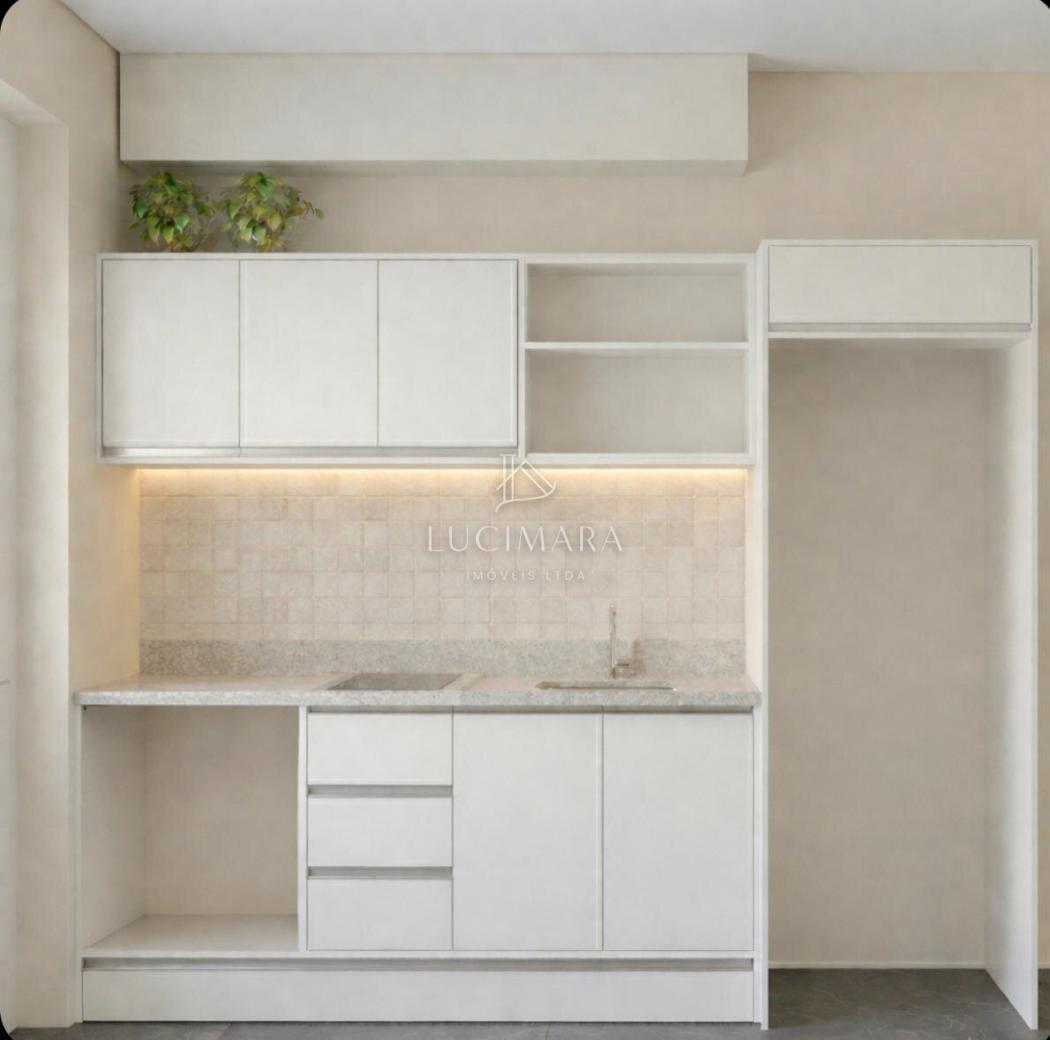 A cozinha conta com pia e armário planejado, bancada de granito com cooktop de indução.