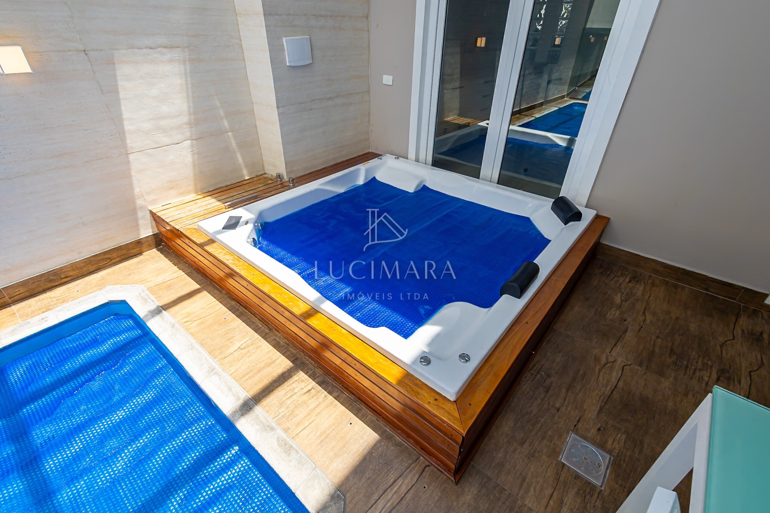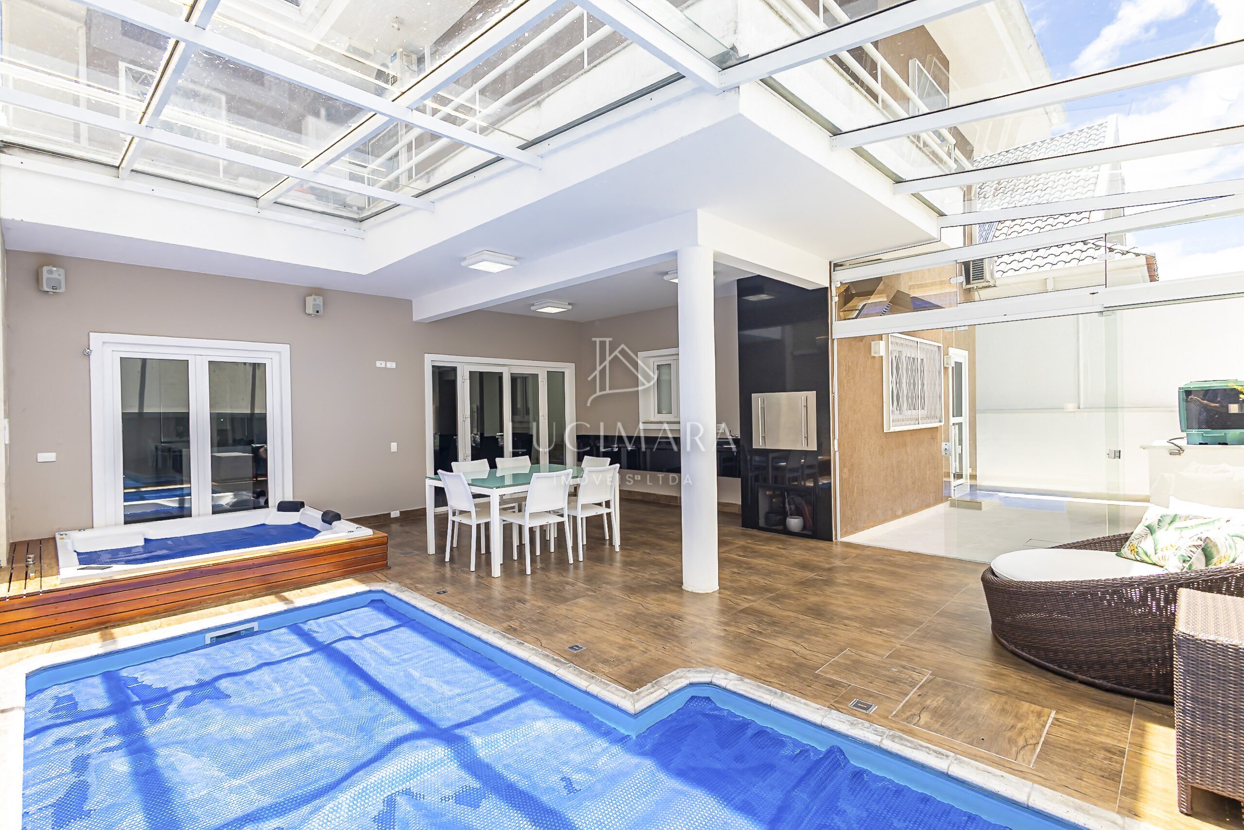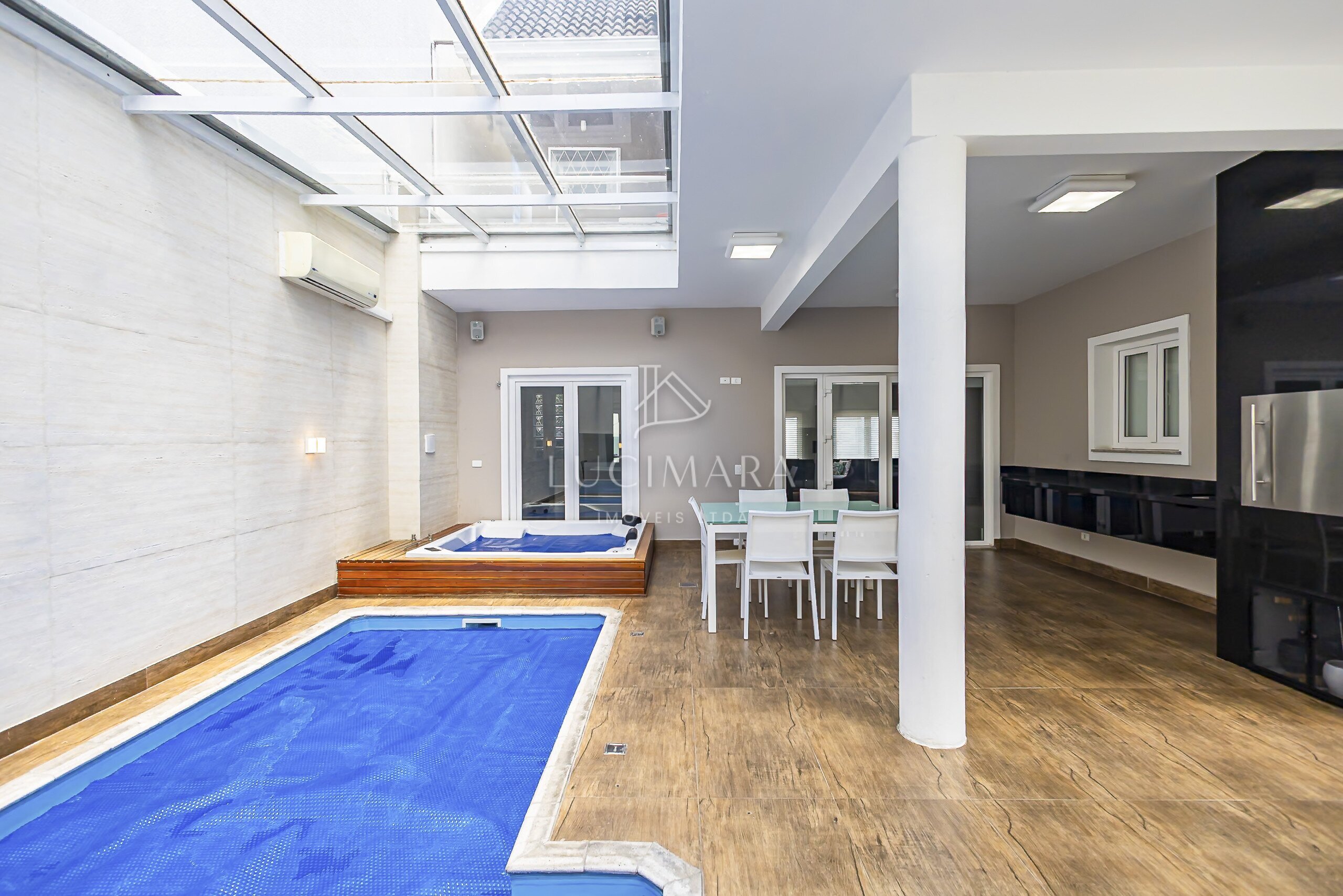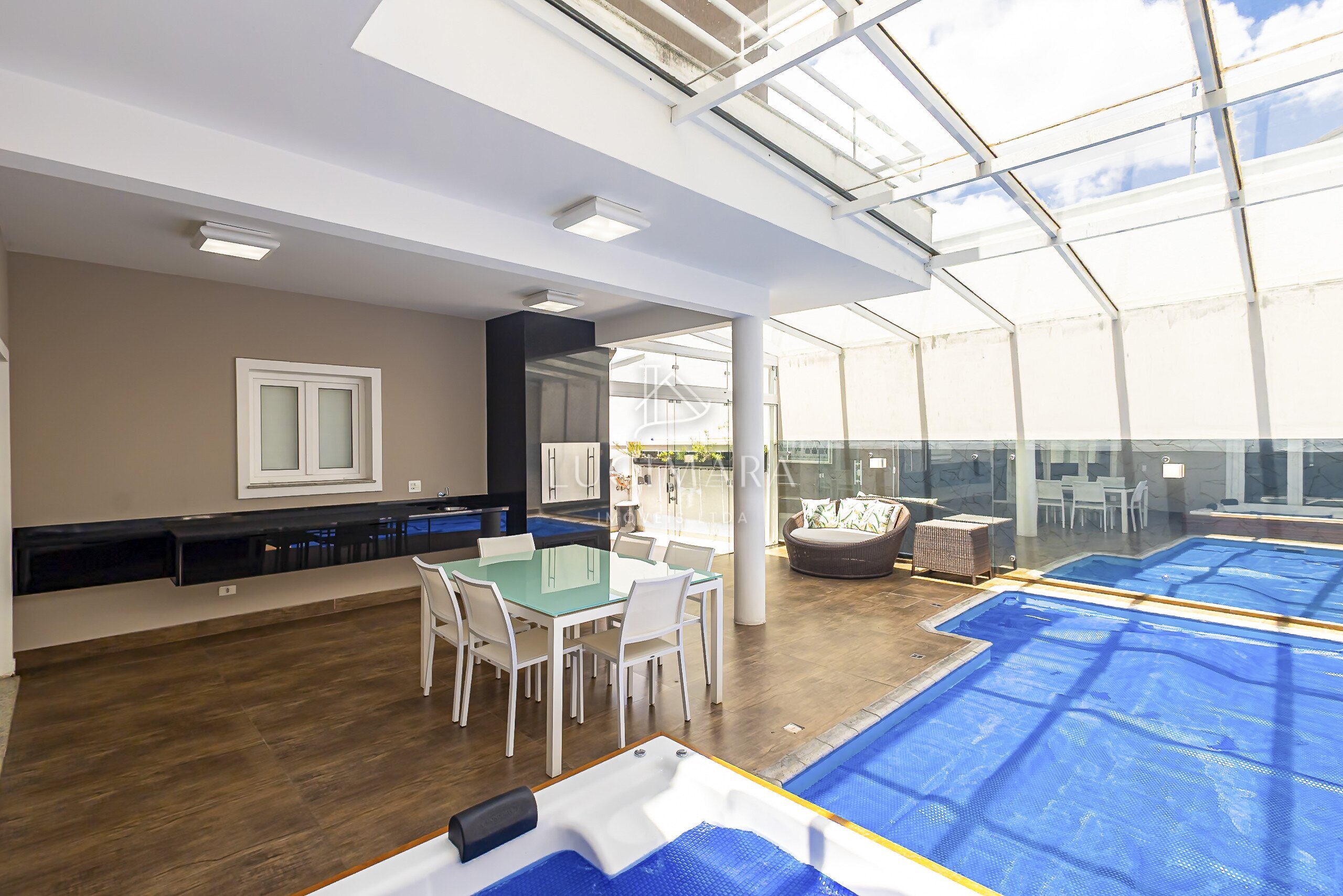 MARAVILHOSA PISCINA COBERTA E AQUECIDA, E O SPAR RETANGULAR E INTEGRANDO COM O ESPAÇO GOURMET.
