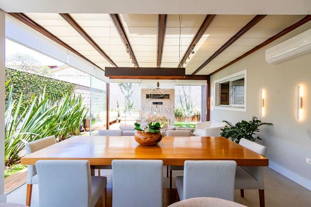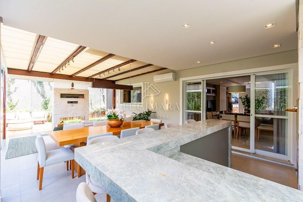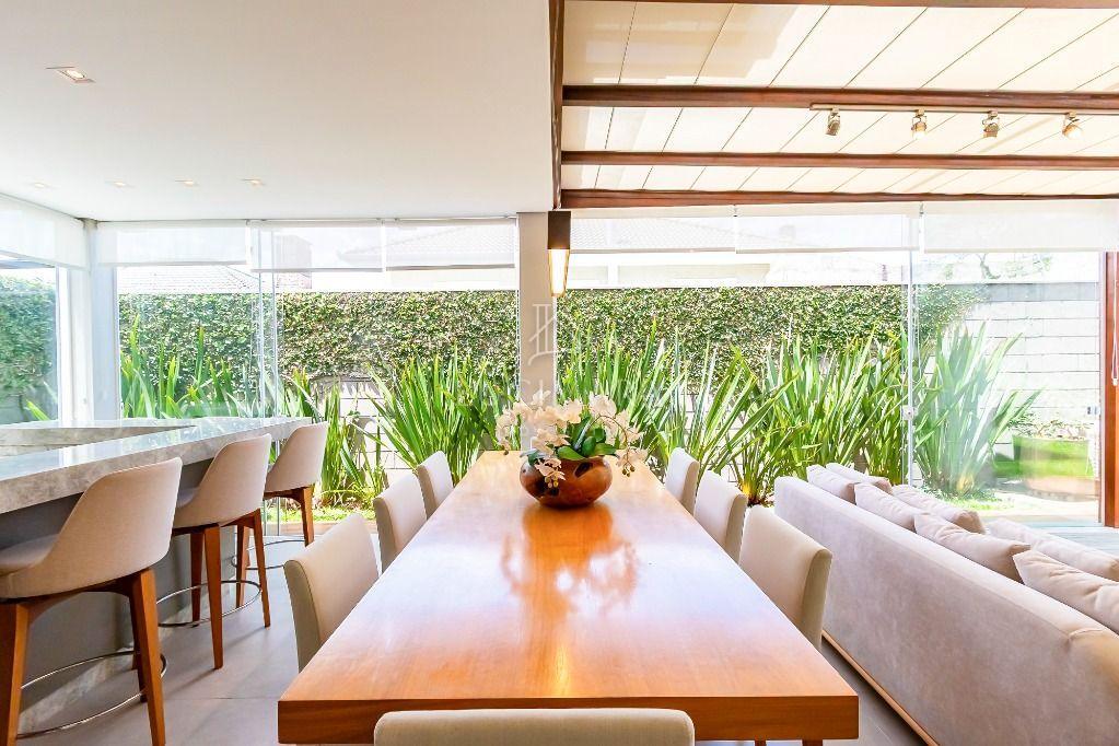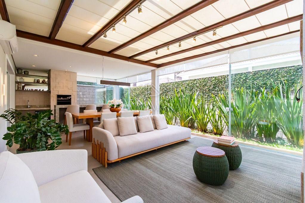 Espaço gourmet impecável, perfeito para receber amigos e familiares, com vista para um belo jardim com móveis de corda náutica.