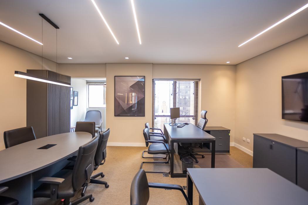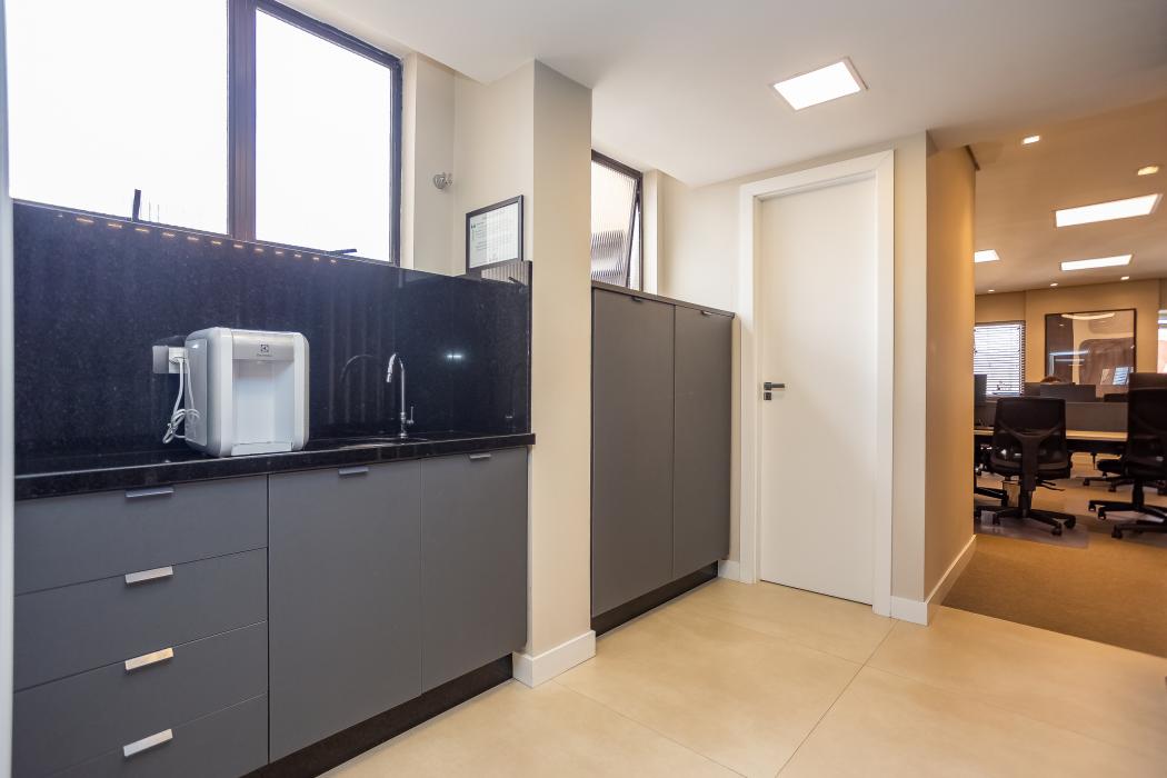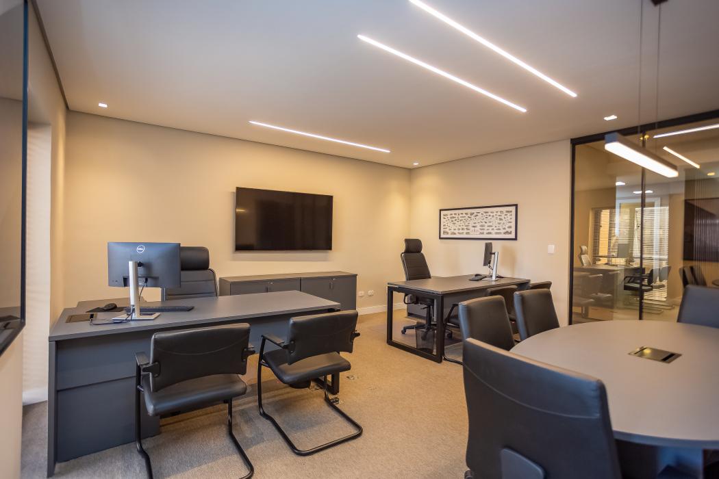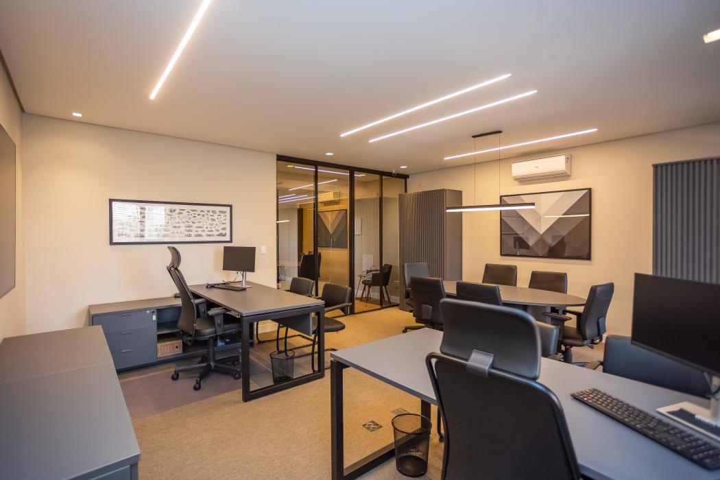 - 1 sala com mesa de reunião, duas estações de trabalho (diretoria) e um cantinho de descanso