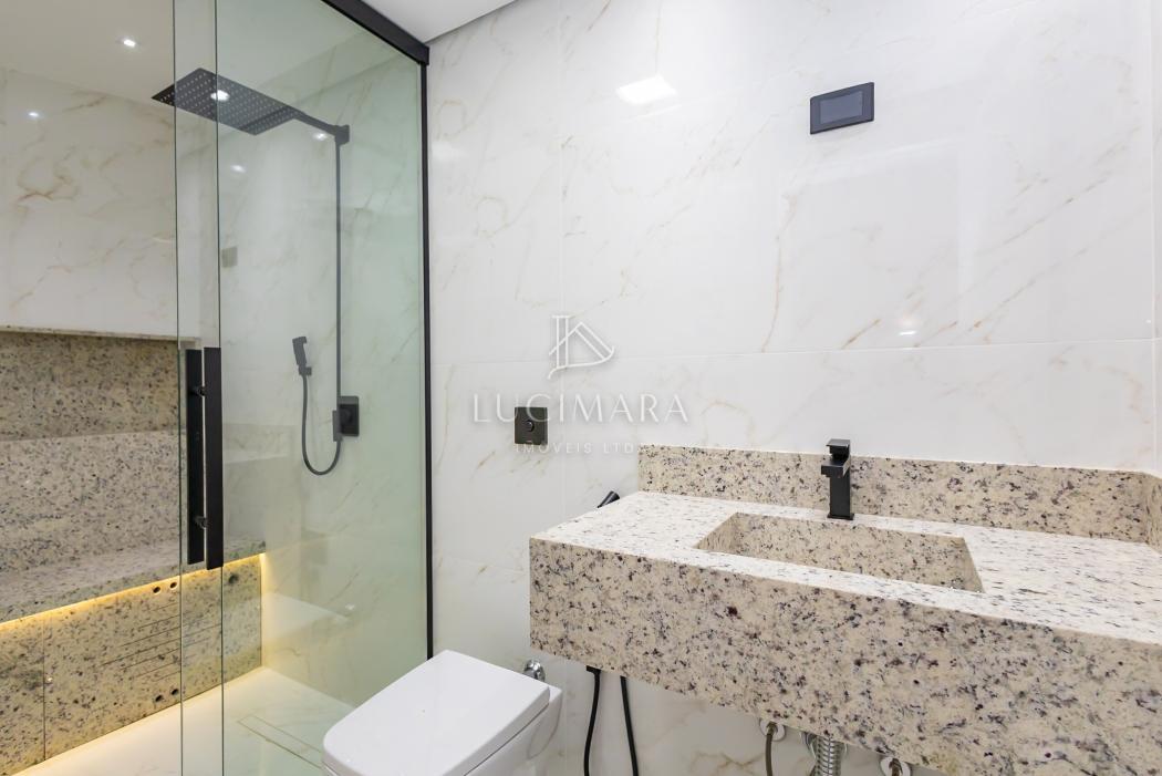 - Banheiro suíte com pia esculpida em mármore, piso aquecido, ducha higiênica, banco de sauna com led, box e metais instalados