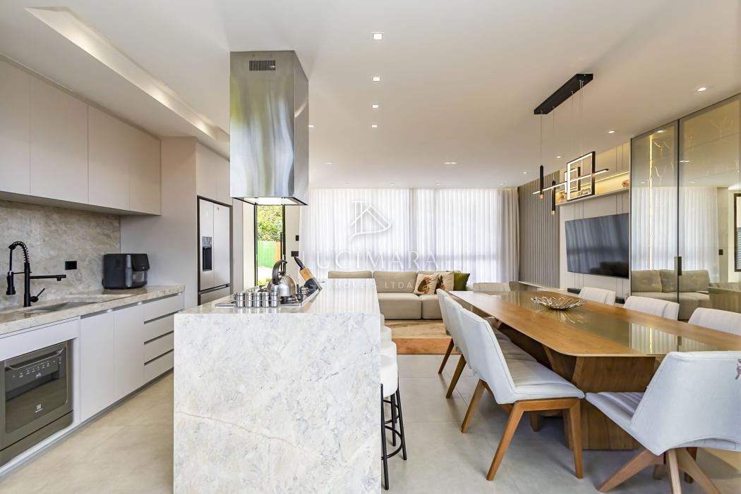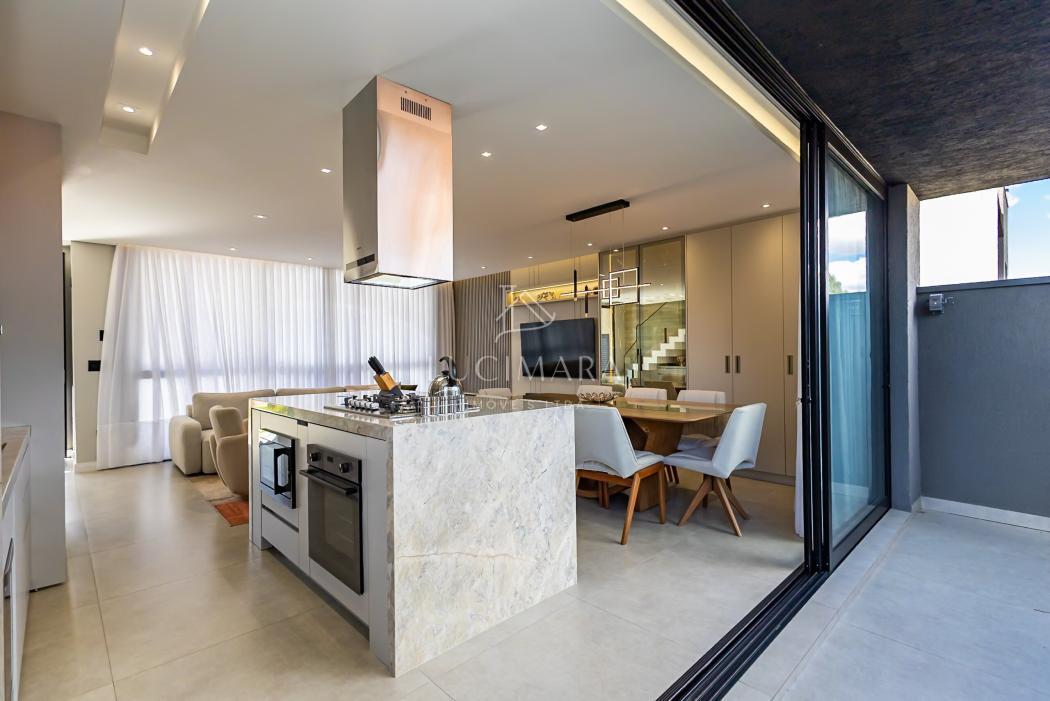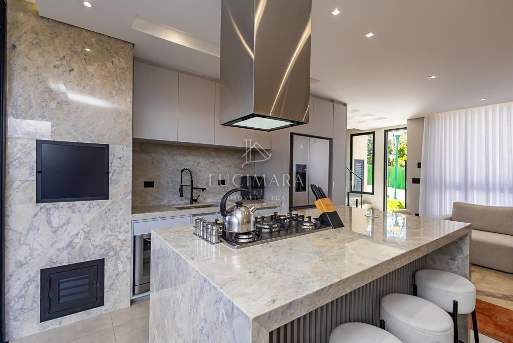 - Cozinha com ilha e churrasqueira em conceito aberto toda mobiliada e equipada com lava louças, microondas, forno, fogão e coifa