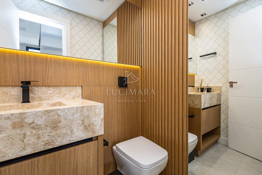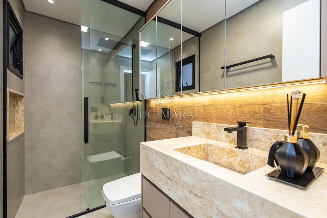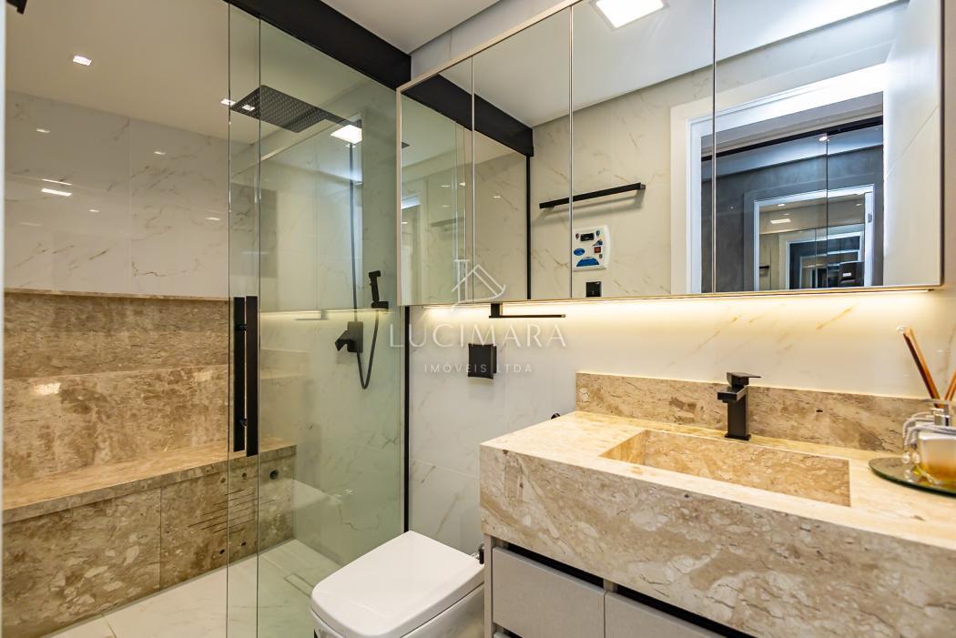 - Banheiro suíte com pia esculpida em mármore, piso aquecido, ducha higiênica, banco de sauna com led, box e metais instalados