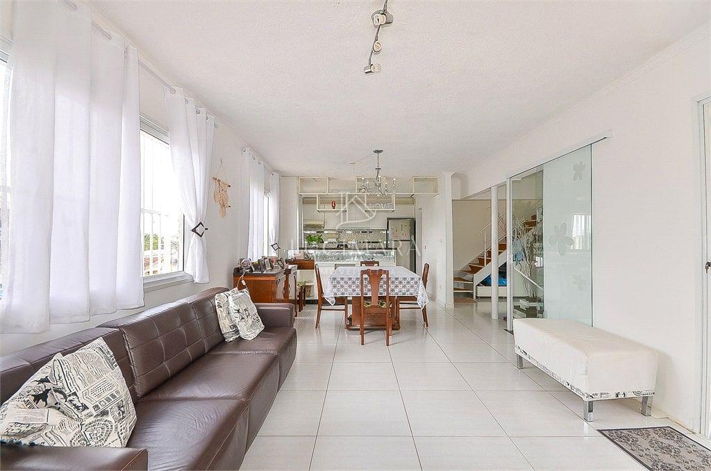 No primeiro andar o imóvel possui 150m² de área construída, churrasqueira, sala e cozinha no conceito aberto, área de serviço/lavanderia, quatro quartos, sendo uma suíte, três quartos possuem closet e atualmente um dos quartos está sendo usado como escritório.